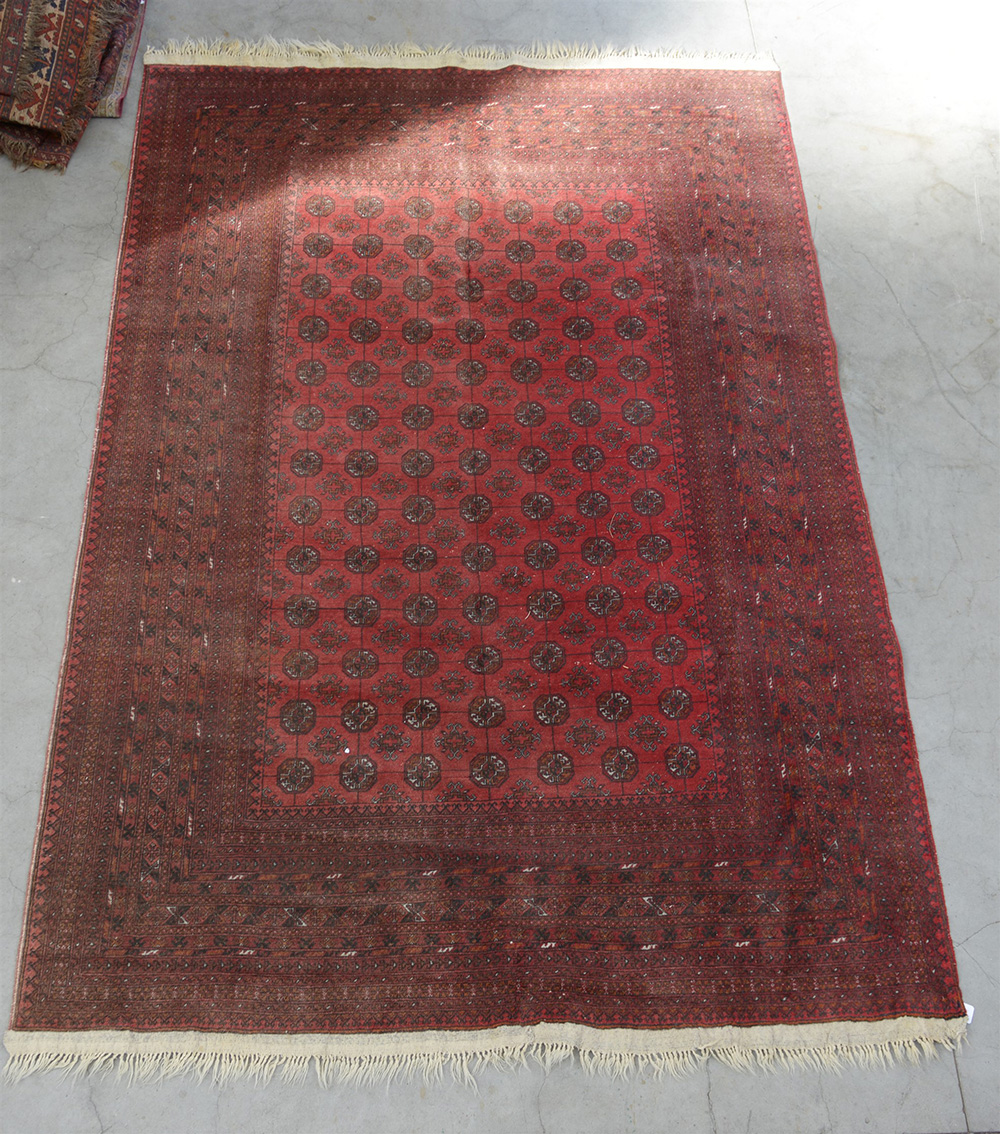 [Tappeti] Tappeto Kizyl Ayak, Turkestan occidentale, sec. XX. Disegno a file di Gul su campo rosso (cm 346x272) (difetti)