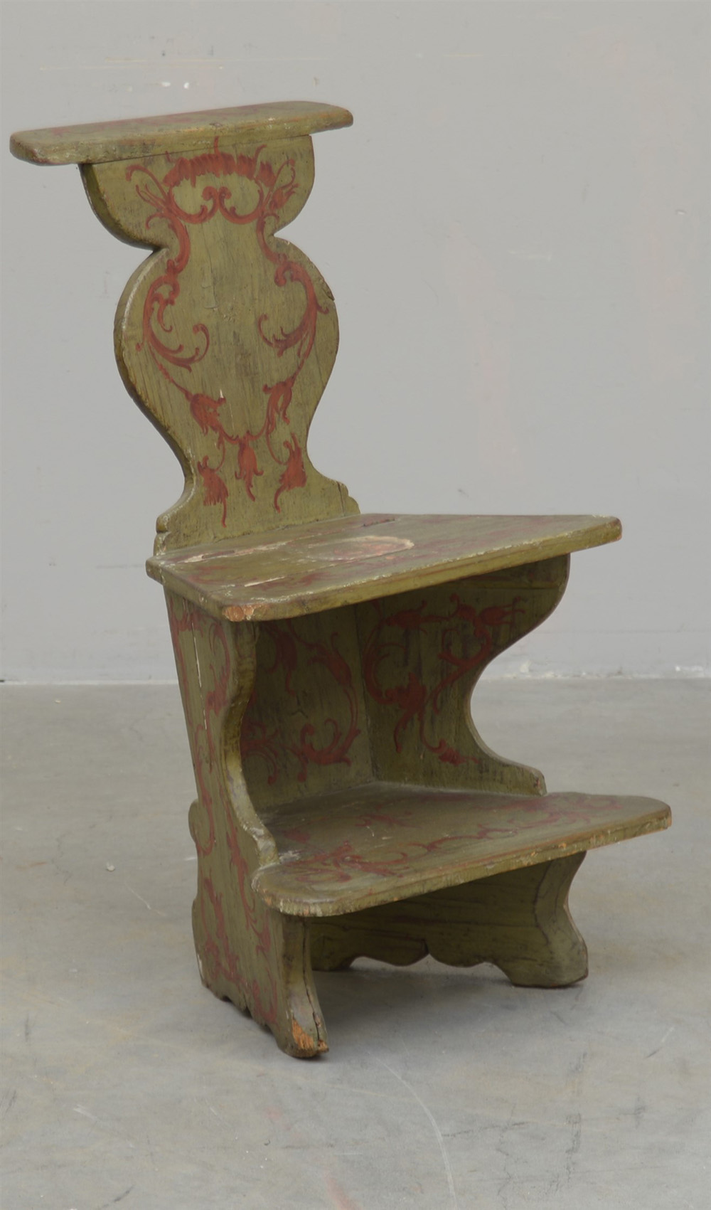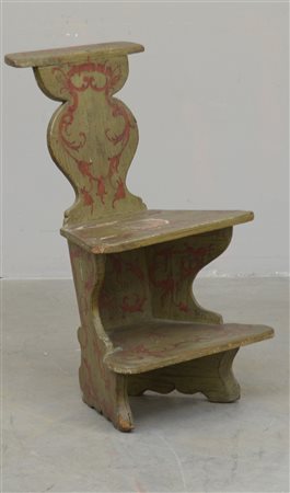 Antico inginocchiatoio di forma sagomata in legno laccato a fondo verde...
