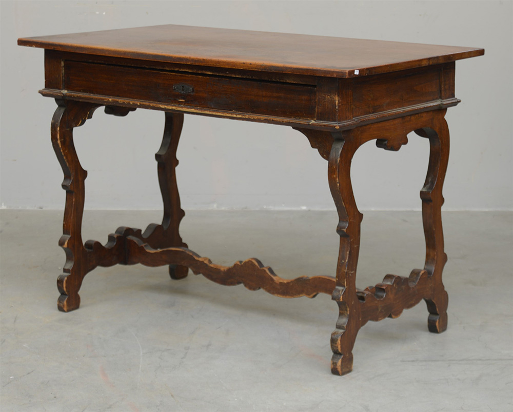 Antico scrittoietto ad un cassetto, gambe e traverse sagomate (cm 115x80x65)(difetti)