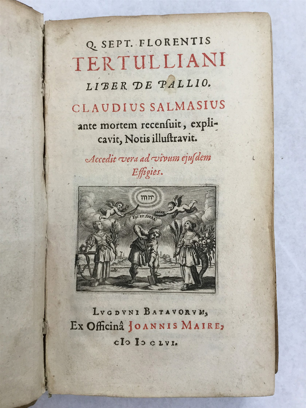 TERTULLIANO. Liber de pallio. Leida: Joannes Maire, 1656. Vol. in 8vo, con marca calcografica al frontespizio (stampato in rosso e nero), iniziali e fregi xilografati. Legatura coeva in piena pergamena con titolo e autore manoscritto al dorso (difetti).