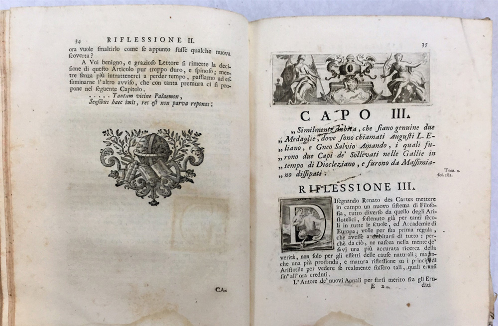 MURATORI, Lodovico Antonio (1672-1750). Riflessioni su le nuove scoverte: per gli Annali d'Italia. Napoli: per Giovanni di Simone, 1746. Vol. in 4to, con marca tipografica al frontespizio, iniziali e fregi xilografate. Legatura coeva in piena pergamena, con titolo e autore manoscritto al dorso (lievi difetti).