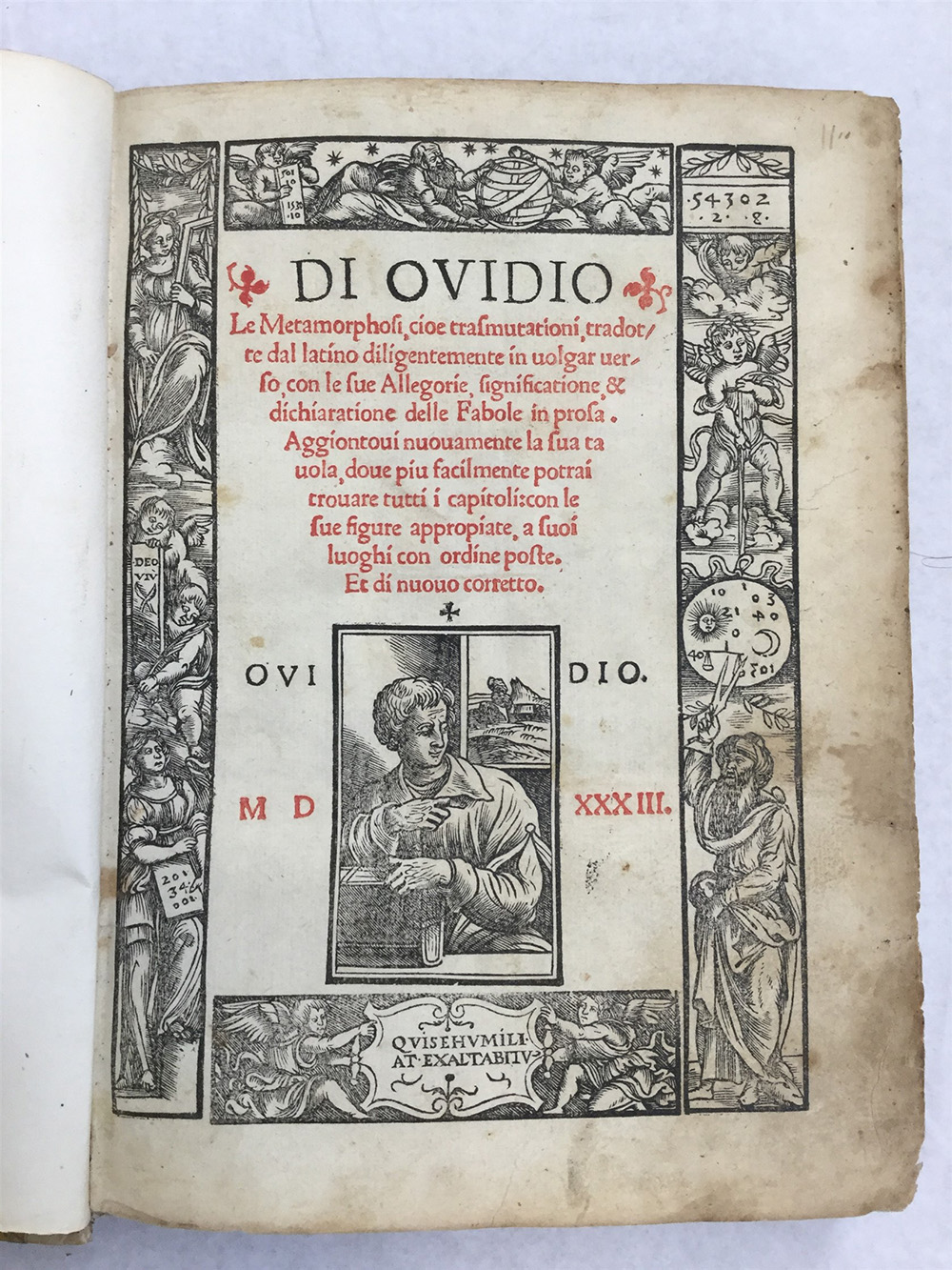 OVIDIO, Naso Publio. Le Metamorphosi. [Venezia]: Nicolo di Aristotile detto Zoppino, 1533. Vol. in 4to, con fregio calcografico al frontespizio (in rosso e nero), fregi e iniziali xilografate (lievi macchie nel testo). Legatura moderna cartonata (compromessa al dorso).
