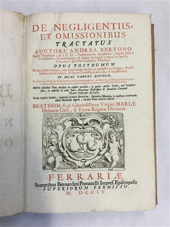 BERTONI, Andrea (m. 1698). De negligentiis et omissionibus tractatus, auctore Andrea Bertono. Ferrara: Bernardino Pomatelli, 1704 (prima edizione). Vol. in folio, con marca tipografico al frontespizio (in rosso e nero), iniziali e fregi xilografati. Legatura in piena pergamena; taglio a spruzzo rosso.