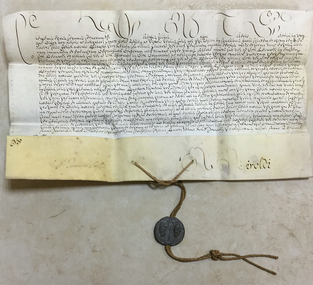Due diplomi su pergamena (anni 1758 e 1767), entrambi emanati dalla Cancelleria Papale sotto Papa Clemente XIII (1758-1769), con sigillo plumbeo originale. Due documenti su pergamena (scrittura su lato carne; dimensioni rispettivamente 205 x 420mm e 240 x 417mm). Stessa mano settecentesca nei due documenti; marginale ornamentazione floreale nel documento del 1758. Regesto posteriore sul lato pelo (lievi difetti).