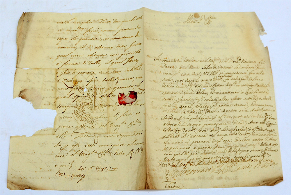 Carteggio datato 1703-1704 fra Domenico Riniero Veronese e Alessandro Jovine(?). Quattro mani diverse coeve, inchiostro ocra. Bifoglio 4to (28 x 201mm). Tracce del sigillo in ceralacca rossa (margini irregolari e strappo sull'ultimo foglio).