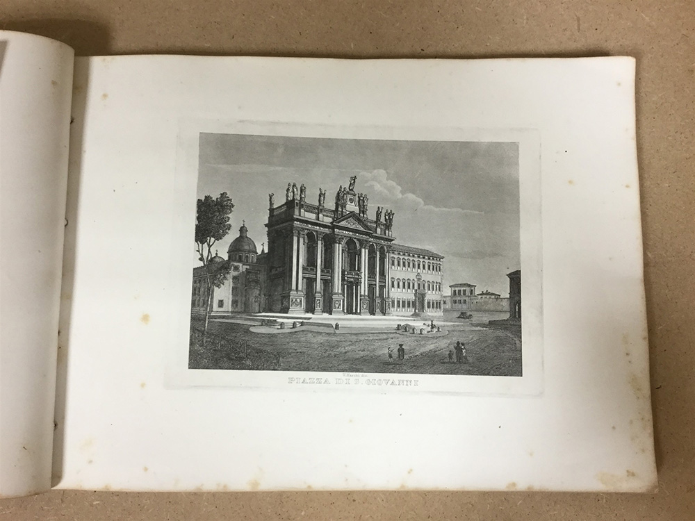 COTTAFAVI, Gaetano (attivo 1837-1864) - Raccolta n. 50 vedute di Roma e contorni disegnate dal vero nel 1858. Roma: Santarelli, s.d. [1858?]. 8vo oblungo (225 x 305mm). 51 vedute di Roma incise da Cottafavi, Marchi (penultima tavola con strappo, alcune fioriture marginali). Brossura originale stampata e decorata in nero al piatto anteriore (lievi difetti).
