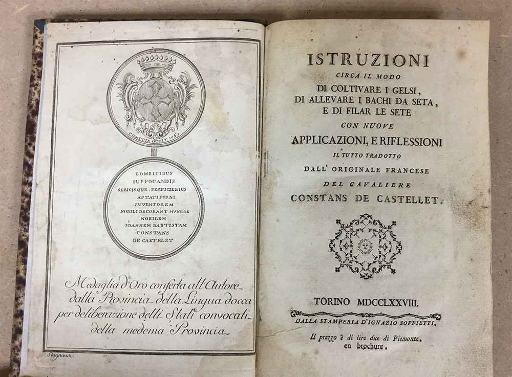 DE CASTELLET, Constans. Istruzioni circa il modo di coltivare i gelsi, di allevare i bachi da seta e di filare le sete. Torino: Soffietti Ignazio, 1778. Volume in 8vo, con incisione in antiporta (lievi bruniture). Legatura in mezza pelle, taglio a spruzzo azzurro (lievi difetti).