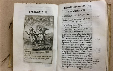 HAEFTEN, Benedetto. Escuela del Corazon. Instruccion para que el Corazon averso se convierta à Dios. Madrid: Imprenta Real, 1720. 2 volumi 16mo, con incisioni nel testo. Legatura coeva in pergamena, con bindelle in cuoio sulla coperta anteriore; titolo manoscritto al dorso (dorso scollato).
