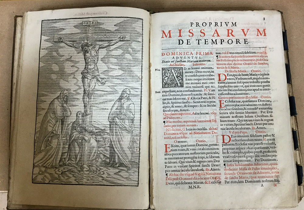 Missale Romanum ex decreto sacrosancti Concilii Tridentini restitutum S. Pii V Pontificis. Venezia: Tipografia Balleoniana, 1643. Volume in folio, con frontespizio stampato in rosso e nero e con incisione; con numerose incisioni nel testo e notazioni musicali. Legatura coeva in piena pelle con titolo in oro al dorso (compromessa, dorso scollato).