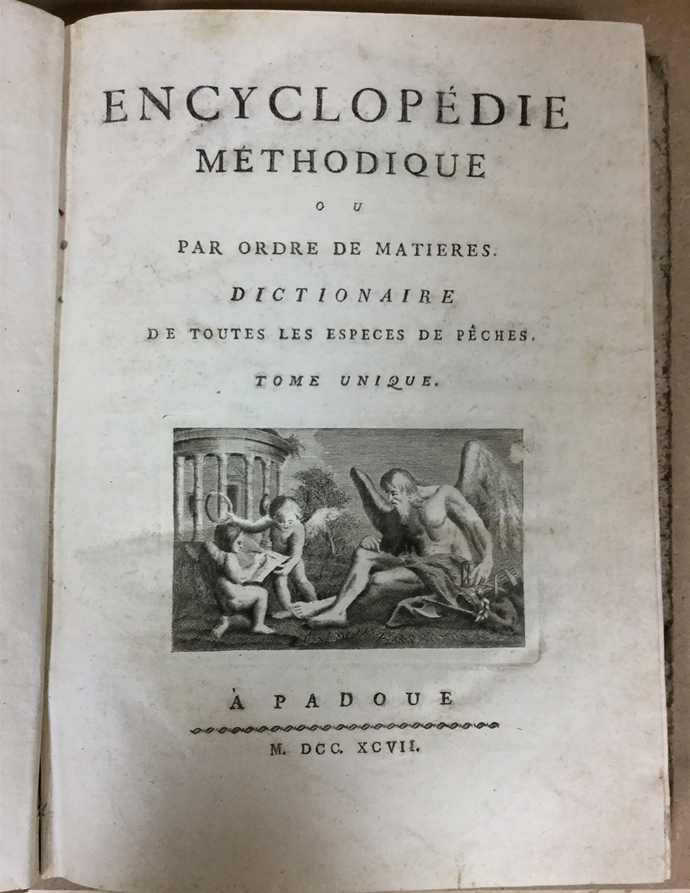 Encyclopédie Méthodique ou par Ordre de Matieres. Dictionaire de toutes les Especes de Pèches. Padova: 1797. Volume 4to, con marca tipografica al frontespizio. Legatura in mezza pergamena con piatti cartonati (lievi difetti).
