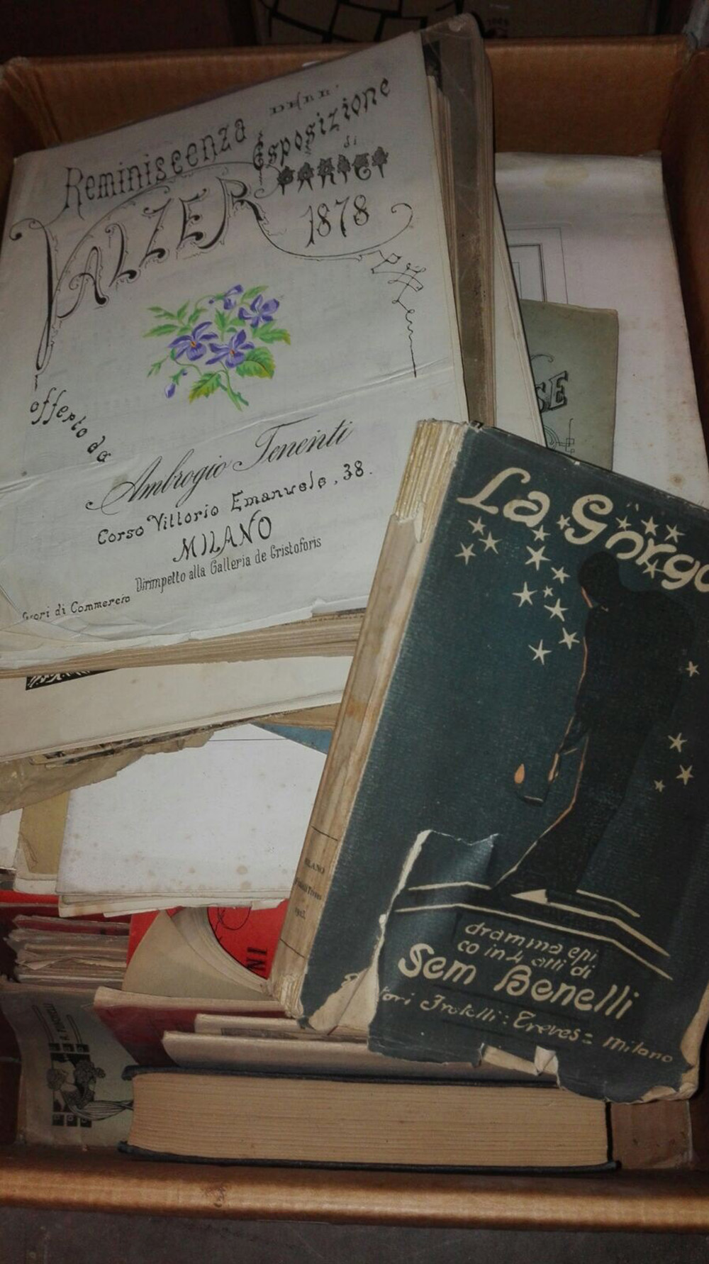 Cartone contenente svariati libretti d'opera e spartiti musicali. Secolo XX.