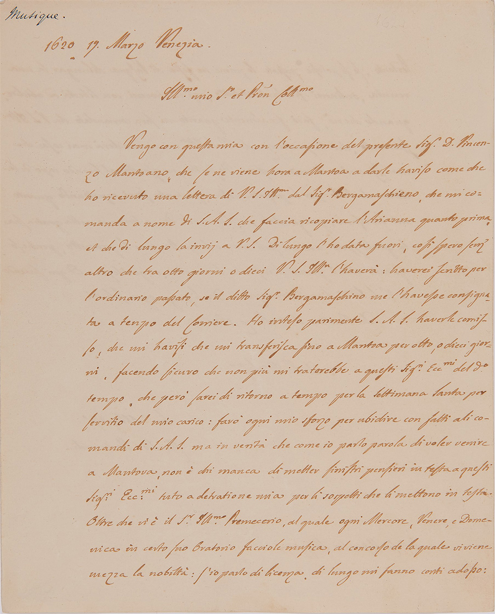 [MONTEVERDI, Claudio (1567-1643)]. Copia di una lettera del compositore italiano, indirizzata ad Alessandro Striggio datata Venezia, 17 marzo 1620. Copia di una lettera di Monteverdi, figura cruciale nel passaggio dalla musica rinascimentale a quella barocca, che collaborò con Alessandro Striggio, librettista dell'Orfeo, una delle opere teatrali più fortunate del Monteverdi. In questa lettera il compositore avvisa Striggi di aver provveduto a inviare il testo dell'Arianna, come da lui stesso richiesto, e di essere in procinto di programmare una visita a Mantova. Lettera su carta (c. 1; 213 x 178 mm). Lettera vergata in una calligrafia elegante e posata. Inchiostro ocra. Stato di conservazione molto buono. -EN [MONTEVERDI, Claudio (1567-1643)]. Copia di una lettera del compositore italiano, indirizzata ad Alessandro Striggio datata Venezia, 17 marzo 1620. Copia di una lettera di Monteverdi, figura cruciale nel passaggio dalla musica rinascimentale a quella barocca, che collaborò con Alessandro Striggio, librettista dell'Orfeo, una delle opere teatrali più fortunate del Monteverdi. In questa lettera il compositore avvisa Striggi di aver provveduto a inviare il testo dell'Arianna, come da lui stesso richiesto, e di essere in procinto di programmare una visita a Mantova. Lettera su carta (c. 1; 213 x 178 mm). Lettera vergata in una calligrafia elegante e posata. Inchiostro ocra. Stato di conservazione molto buono. Copy of a letter by Monteverdi addressed to Alessandro Stiggio and dated Venice, 17 March, 1620.