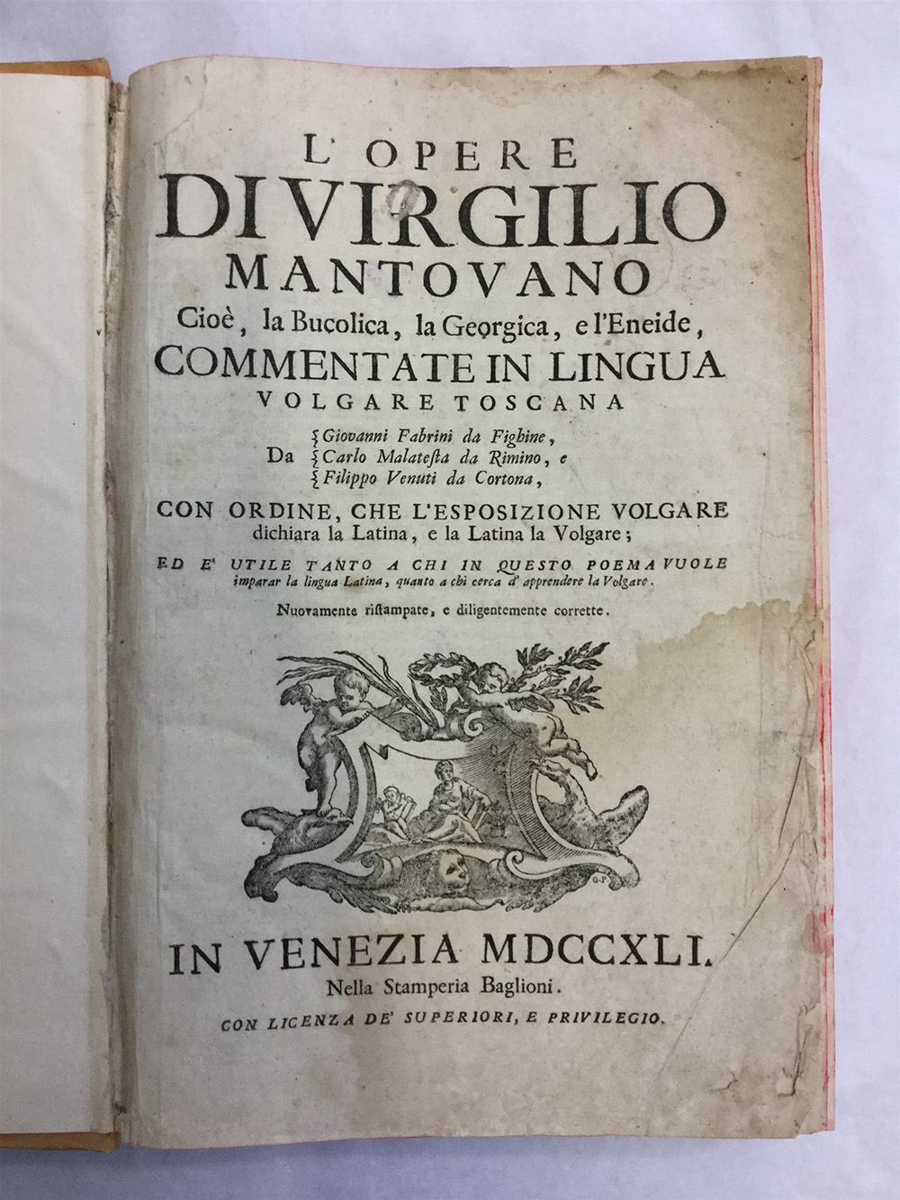 L'opere di Virgilio Mantovano commentate in lingua volgare toscana. Venezia: Stamperia Baglioni, 1741. Vol. in folio, con iniziali e fregi xilografati (lievi fioriture e gore d'acqua nel margine inferiore nelle ultime carte). Legatura moderna in piena pergamena, tagli rossi.