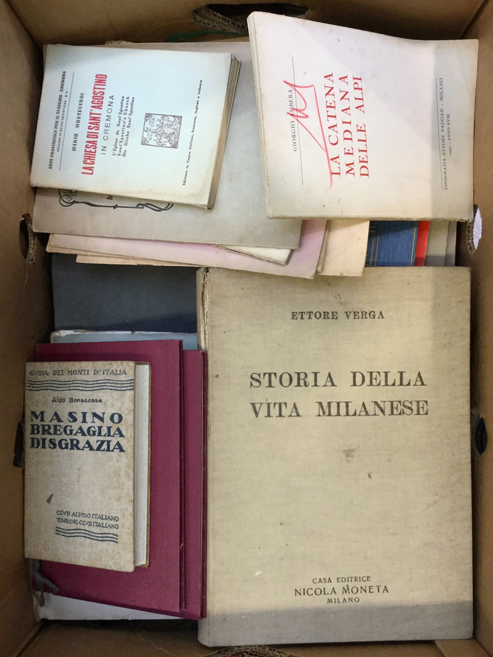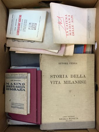 Lotto composto da numerose pubblicazioni, per la maggior parte illustrate, inerenti la storia locale della Lombardia e della Liguria, fra cui ad esempio: - BOSELLI, Paolo. Discorsi e scritti. Torino: Baravalle e Falconieri, 1915-19 (4 voll.); - FRIGERIO, Federico. Il Duomo di Como e il Broletto. Como: Cesare Nani, 1950; - MAGISTRETTI, Marco. Delle vesti ecclesiastiche in Milano. Milano: Casa Editrice L.F. Cogliati, 1905 (II edizione accresciuta); - VERGA, Ettore. Storia della vita milanese. Milano: Nicola Moneta, 1931. In due cartoni (lievi difetti).
