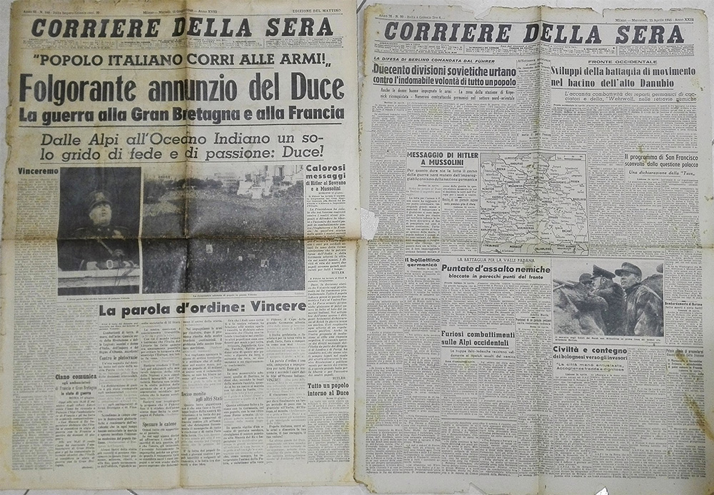 Numerosi fascicoli del Corriere della Sera dal martedì 11 giugno 1940, al mecoledì 25 aprile 1945. In quattro cartoni.