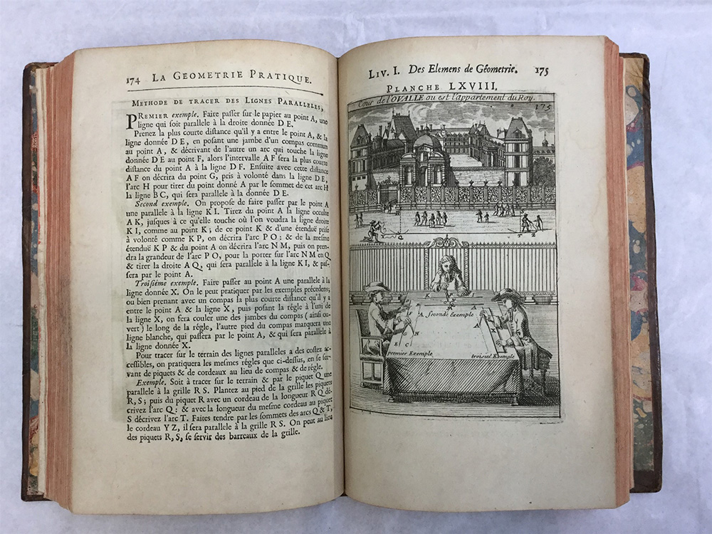 [MANESSON MALLET, Alain]. La geometrie pratique divisée en quatre livres. Parigi: Anisson Imprimerie Royale, 1702. 3 volumi (su 4) in 8vo, con ritratto di re Luigi XIV in antiporta nel primo volume e numerosi incisioni (lievi difetti). Legatura in piena pelle di vitello, taglio rosso (angoli e dorsi spellati).