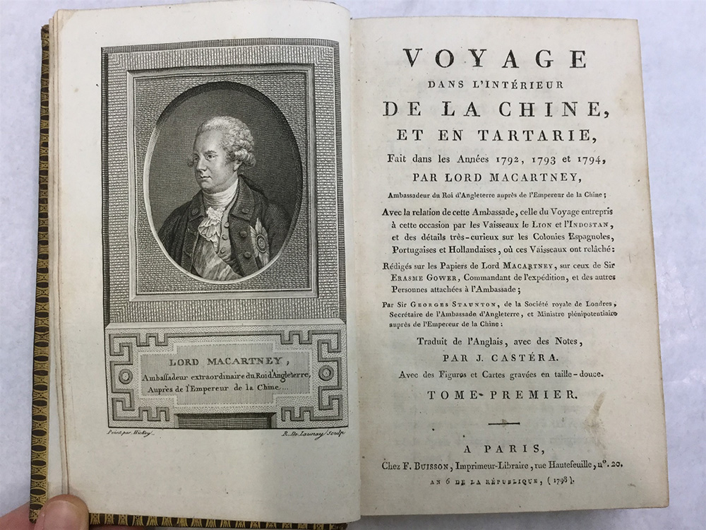 MACARTNEY, George Lord. Voyage dans l'Interieur de la Chine et en Tartare. Parigi: F. Buisson, 1798. 3 volumi in 8vo (voll. I, II e IV), con incisione in antiporta in ogni volume e carte geografiche fuori testo nel IV volume (lievi difetti). Legatura in piena pelle con decorazioni in oro ai piatti, taglio in oro.