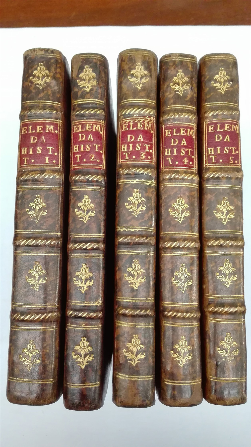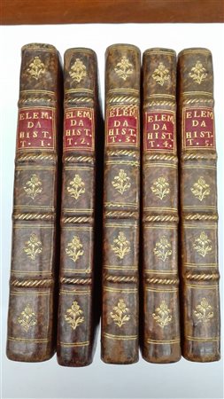 DE SOUSA, Pedro. Elementos da Historia. Lisbona: Officina de Antonio Vicente da Silva, 1766-67. 5 volumi in 4to, con marca tipografica al frontespizio. Legatura in piena pelle, taglio rosso, titolo sui dorsi (lievi difetti).