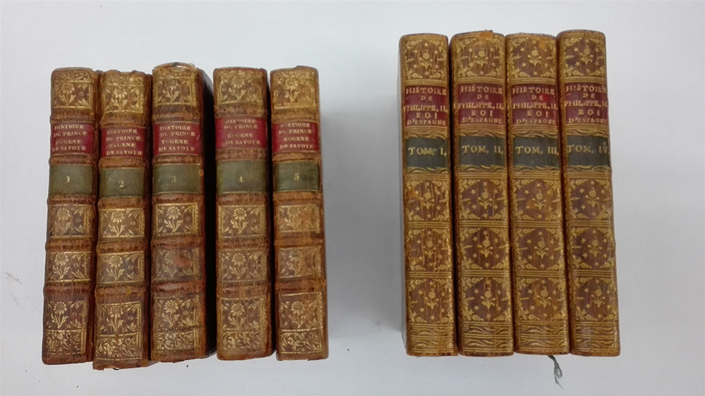 Lotto composto dalle seguenti opere di contenuto biografico-storico: - Histoire du prince Francois Eugene de Savoie. Amsterdam e Lipsia: Arkstee & Merkus, 1750. 5 volumi in 12mo, con ritratto del principe in antiporta al primo volume e svariate tavole fuori testo (lievi fioriture). Legatura in piena pelle, taglio rosso. - Histoire du regne de Philippe II, roi d'Espagne. Amsterdam: D.J. Changuion, 1778. 4 volumi in 8vo, con ritratto del regnante in antiporta. Legatura in mezza pelle, taglio rosso.