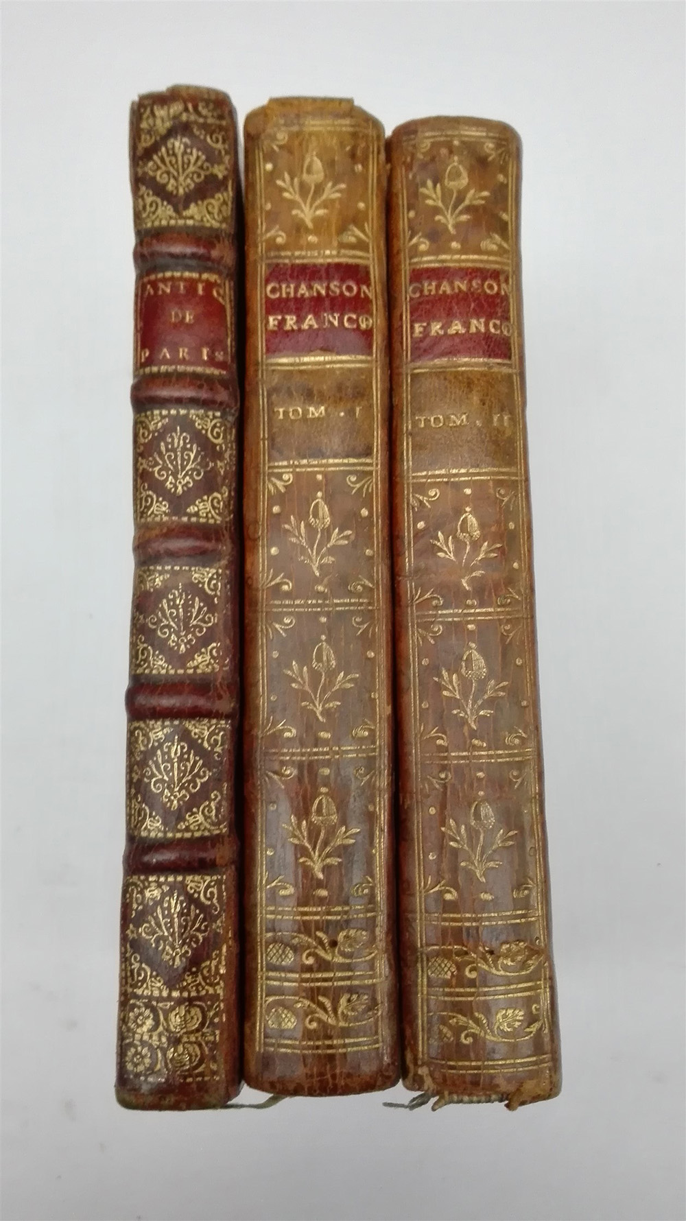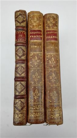 Lotto composto dalle seguenti opere: - Les antiquitez et singularitez de Paris. Parigi: Nicolas Bonfons, 1588. Volume in 8vo, con numerose incisioni raffiguranti alcuni particolari artistici della città di Parigi (tracce di tarli e bruniture). Legatura in piena pelle, taglio marmorizzato (lievi difetti). - Le petit chansonnier francois, ou choix des meilleurs chansons. Ginevra: [s.e.], 1778. 2 volumi in 8vo. Legatura in piena pelle, taglio rosso.