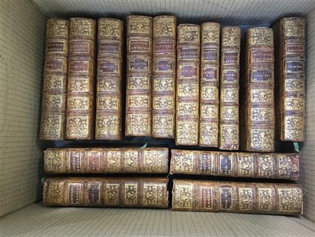 ROLLIN, Charles. Histoire ancienne des Egyptiens, des Carthaginois, des Assyriens. Parigi: chez la Veuve Estienne & Fils, 1748-52. 14 volumi in 8vo (lievi bruniture e fioriture). Legatura in piena pelle con titolo al dorso, taglio rosso (lievi difetti). In cartone.