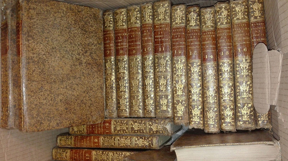 Lotto composto dalle seguente opere su Federico II di Prussia: - Oeuvres Primitives de Fréderic II, Roi de Prusse. Postdam: [s.e.], 1803. 4 volumi in 8vo, con ritratto del sovrano in antiporta nel primo volume. - Nouvelle vie de Fréderic II, Roi de Prusse. Postdam: [s.e.], 1803. Volume in 8vo, con incisione in antiporta. -Oeuvres Posthumes de Fréderic II, Roi de Prusse. Postdam: [s.e.], 1803. 19 volumi in 8vo. Legatura omogenea in piena pelle, con titolo al dorso (lievi difetti). In cartone.