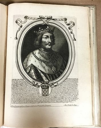 ARMESSIN, Nicolas. Les Augustes representations de tous les Roys de France depuis Pharamond, jusqu'à Louys XIIII, dit le Grand. Parigi: chez la Veuve P. Bertand, 1679. Volume in folio, con frontespizio inciso, con 64 incisioni raffiguranti i ritratti dei sovrani. Legatura in piena pergamena posteriore (lievi difetti).