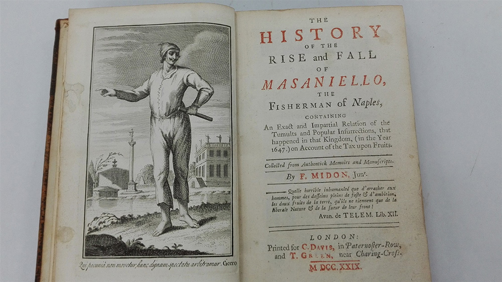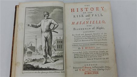 MIDON, Francis. The History of the Rise and Fall of Masaniello, The Fisherman of Naples. Londra: C. Davis, 1729. Volume in 8vo, con incisione raffigurante Masaniello in antiporta. Legatura settecentesca in piena pelle con impressioni a secco a doppia cornice sui piatti (lievi difetti).