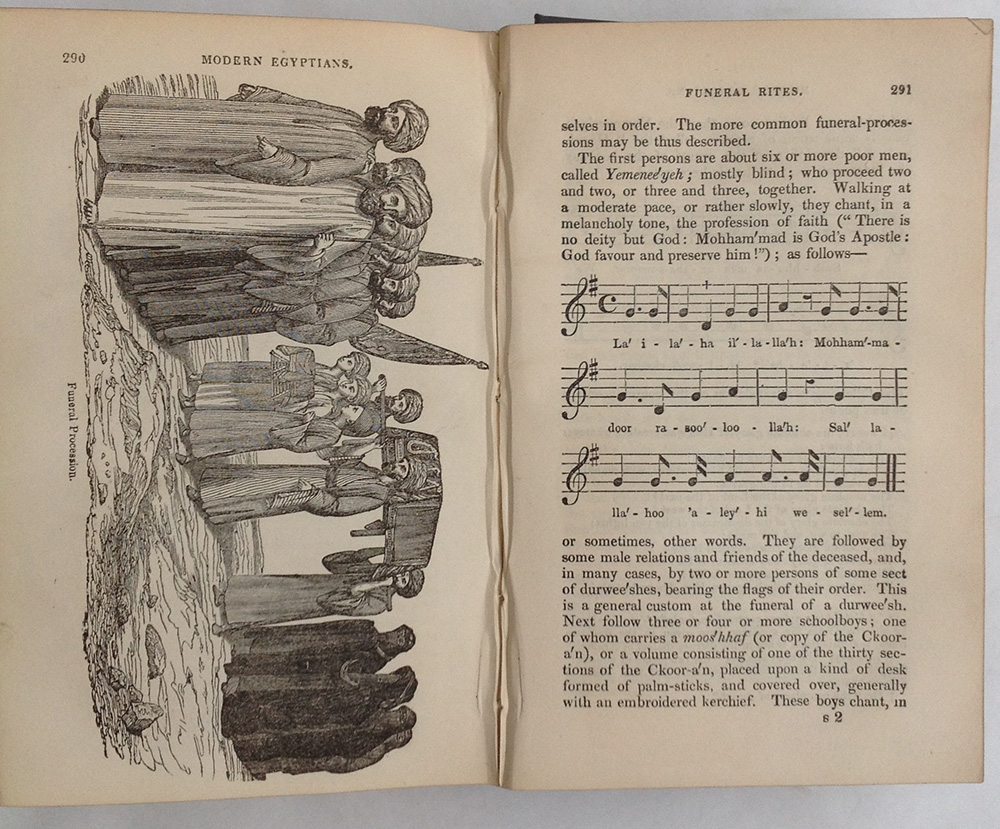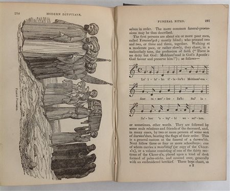LANE, Edward William. An Account of the Manners and Customs of the Modern Egyptians. Londra: Nattali, 1849. Vol. in 12mo (due volumi in un tomo), con numerose illustrazioni in bianco e nero. Legatura in piena tela blu con decorazioni impresse a secco ai piatti e titolo in oro al dorso, tagli dorati (lievi difetti).
