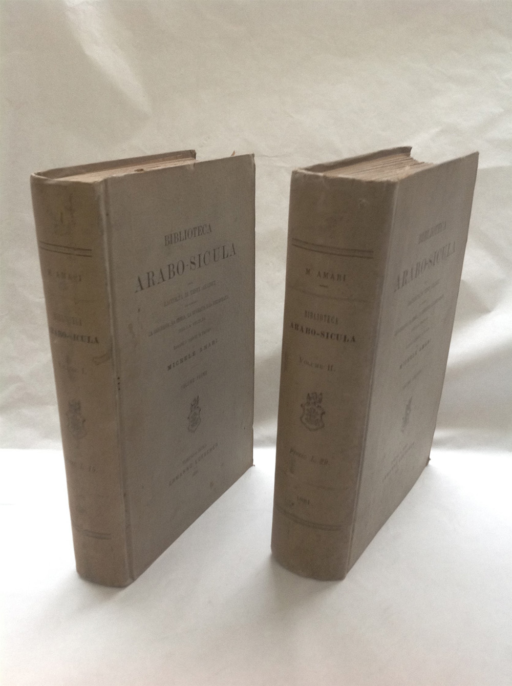 AMARI, Michele. Bibliotheca Arabo-Sicula. Torino e Roma: Ermanno Loescher, 1880-81. Due voll. in 4to, contenenti testi arabici inerenti la storia e la geografia della Sicilia (lievi fioriture e bruniture). Legatura editoriale cartonata; esemplare non tagliato (lievi difetti).