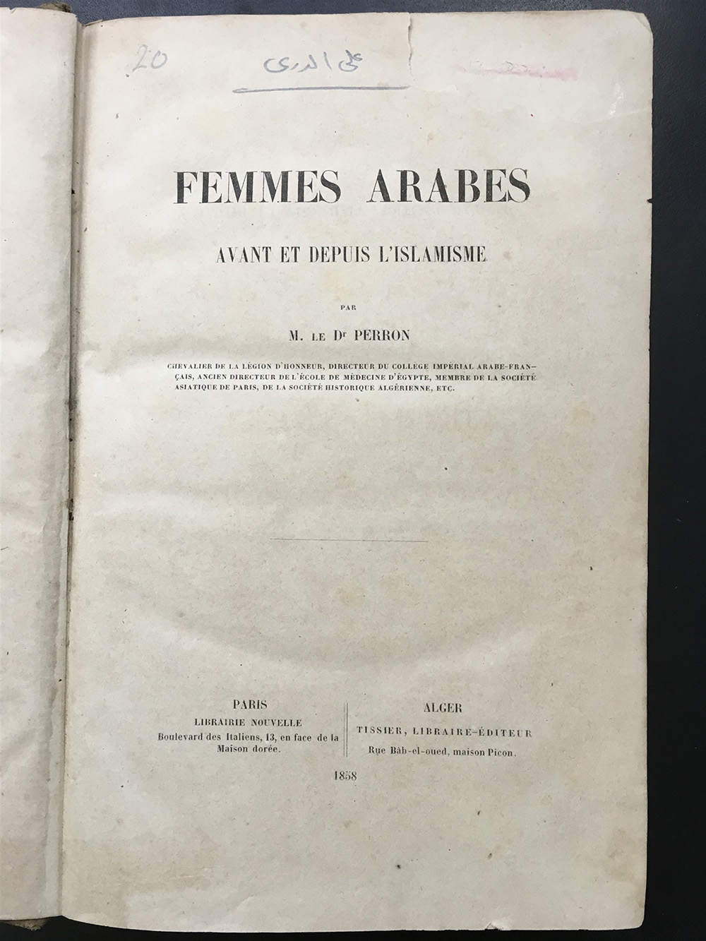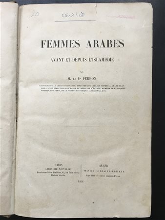 PERRON, Nicolas. Femmes Arabes avant et depuis l’Islamisme. Parigi e Algeri, 1858. Vol. in 4to. Prima edizione di quest’opera. Legatura coeva in mezza pelle (lievi difetti).