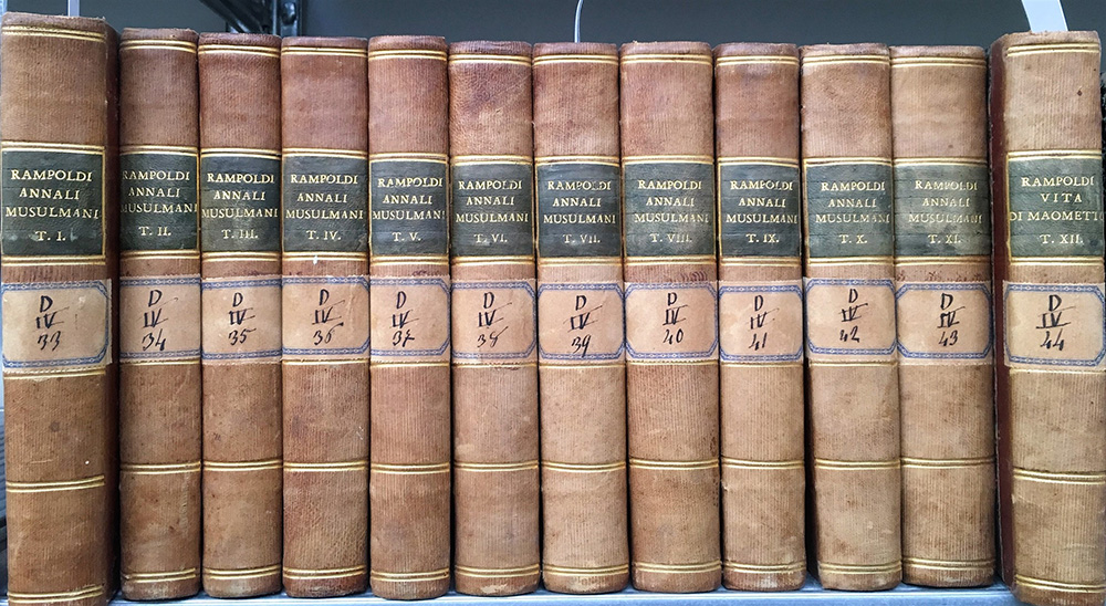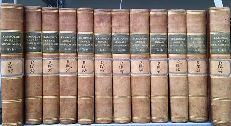 RAMPOLDI, Giovanni Battista. Annali Musulmani. Dal 578 al 1453 dell’era volgare. Milano: Tipografia di Felice Rusconi, 1822-25; Vita di Maometto. Milano: Tipografia di Felice Rusconi, 1822. Dodici voll. in 8vo. Prima edizione di quest’opera (lievi fioriture). Legatura in mezza pelle e piatti marmorizzati (lievi difetti).