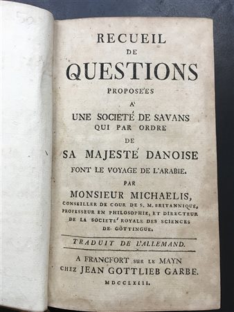 MICHAELIS, Johann Davis. Recueil de Questions proposées a une societé de savans. Francoforte sul Meno: Jean Gottlieb Garbe, 1763. Vol. in 8vo, con fregio e iniziale xilografica e 4 tavole cronologiche ripiegate (esemplare brunito). Prima edizione in lingua francese. Legatura in piena pelle con decorazioni in oro al dorso, taglio rosso (difetti). Provenienza: Valperga di Masino e di Caluso – ex libris.