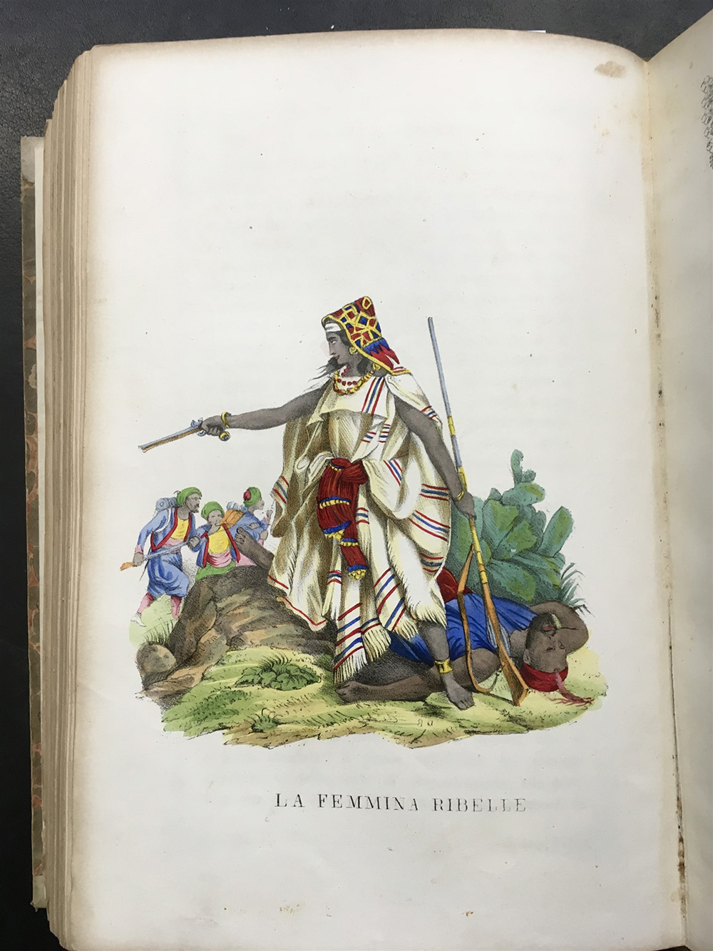 CHRISTIAN, Pitois. L’Affrica francese. L’Impero del Marocco e i deserti di Sahara. Firenze: Giuseppe Celli, 1846. Prima edizione. Due voll. in 4to, con numerossisime tavole fuori testo a colori raffiguranti personaggi, costumi dell’epoca ed episodi notevoli della storia del Nord Africa (fioriture). Legatura in mezza pergamena e piatti marmorizzati (lievi difetti).