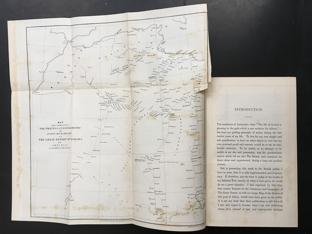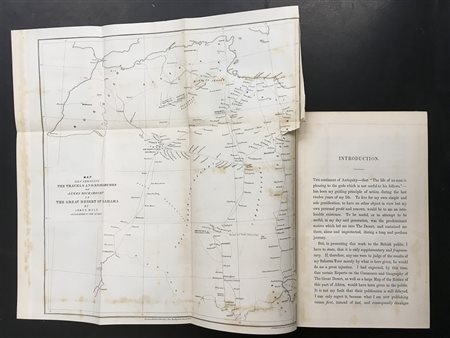 RICHARDSON, James. Travels in the Great Desert of Sahara. Londra: Richard Bentley, 1848. Due voll. in 8vo, con ritratto dell’autore in antiporta nel primo volume e scena di una tempesta di sabbia nel secondo; cartina geografica ripiegata nel primo volume, illustrazioni e tavole in bianco e nero (fioriture, bruniture). Legatura in piena pelle di colore verde con doppia cornice in oro ai piatti, taglio marmorizzato (piatti staccati, pelle lievemente sfregata).