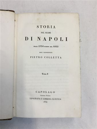 COLLETTA, Pietro. Storia del reame di Napoli dal 1754 sino al 1825. Capolago: Tipografia e Libreria Elvetica, 1834. Due volumi in 8vo, rilegati in mezza pelle (lievi difetti)