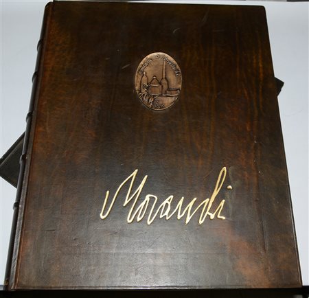 Omaggio a Morandi. Esemplare n. 7 su 1200. Due volumi in folio con 50 tavole, riproduzioni degli acquerelli direttamente sugli originali in offset, a fogli sciolti. L'esemplare è mancante dell'incisione originale di Morandi. Legatura in pelle marrone; custodia editoriale in pelle.
