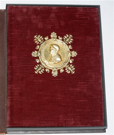 Breviario Grimani. Facsimile del secolo XVI. Electa, [s.d.]. Legatura in velluto bordeaux; sulla coperta anteriore applicato il medaglione dorato raffigurante il busto del Cardinale Grimani. Si allega il Commentario in piena pelle marrone. Entro cofanetto. Esemplare 300/300.