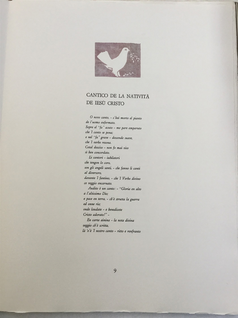 MANFREDI, Alberto. Iacopone Laude. Milano: Cerastico Editore, 1967. Esemplare 23/120, con cinque linoleum a colori a piena pagina numerati e firmati e nove linoleum a colori inseriti nel testo, tirati da Duilio Rossoni. Formato atlantico, fogli sciolti entro cartone editoriale. Entro custodia originale.