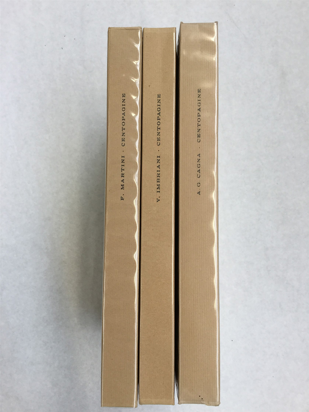 AA.VV. Centopagine. Milano: Libri Scheiwiller, 1985-87. 3 volumi 4to. Tiratura rispettivamente 12/200, 47/300, 76/400. Legatura editoriale cartonata, ciascuno entro custodia.