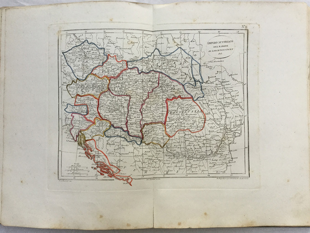 Atlante Universale e Portatile di Geografia Antica e Moderna. Napoli: presso il Gabinetto Letterario, 1817. 4to, con 32 carte geografiche in parte incise da Marco di Pietro in Napoli presso Giustino Merolla, in parte da G. Bartoli (fioriture diffuse). Legatura posteriore in piena tela blu, con frontespizio ritagliato e incollato.