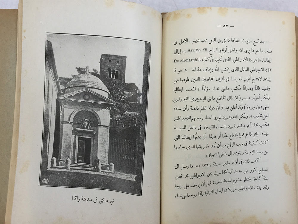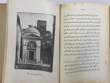 Lotto composto da 8 opere di epoca e argomento differente, fra cui una curiosa edizione della Divina Commedia di Dante Alighieri in lingua araba con dedica autografa dell'autore (lievi difetti).