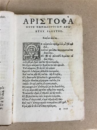 ARISTOFANE. Aristophanis comoediae undecim. [s.l.]: Giovanni Grifo, 1548. Volume in 8vo (gore di umidità e lievi fioriture) in lingua greca. Legatura in mezza pelle.
