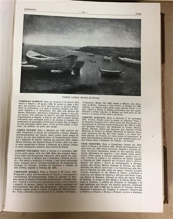 COMANDUCCI, Agostino Mario. I pittori italiani dell'ottocento. Dizionario critico e documentario. Milano: Casa Editrice Artisti d'Italia s.a., 1934. Volume in 4to (ottime condizioni), esemplare non numerato di 256 copie, prefazione a cura di Innocenzo Cappa. Opera riccamente illustrata in bianco e nero. Legatura in mezza pelle con scritte in oro sul dorso.
