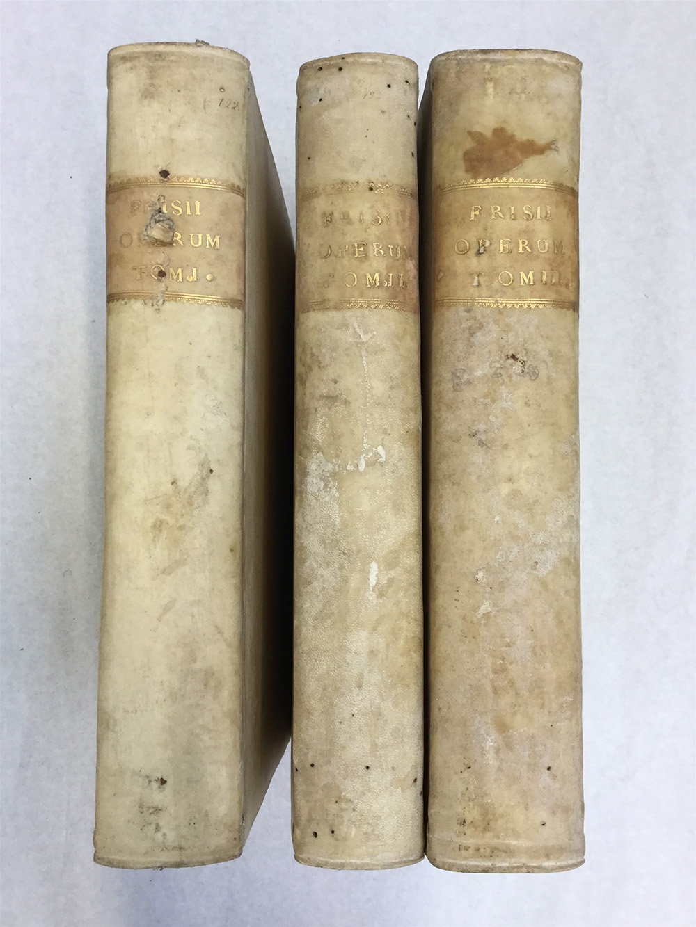 FRISI, Paolo. Operum. Milano: Giuseppe Galeazzio, 1782-85. 3 Voll. in 4to grande, con numerose tavole incie in rame, vignetta incisa al frontespizio al primo volume. Legatura coeva in piena pergamena, tagli rossi. Alla fine del primo volume è legato un altro testo dell'autore pubblicato a Milano. Bella copia.