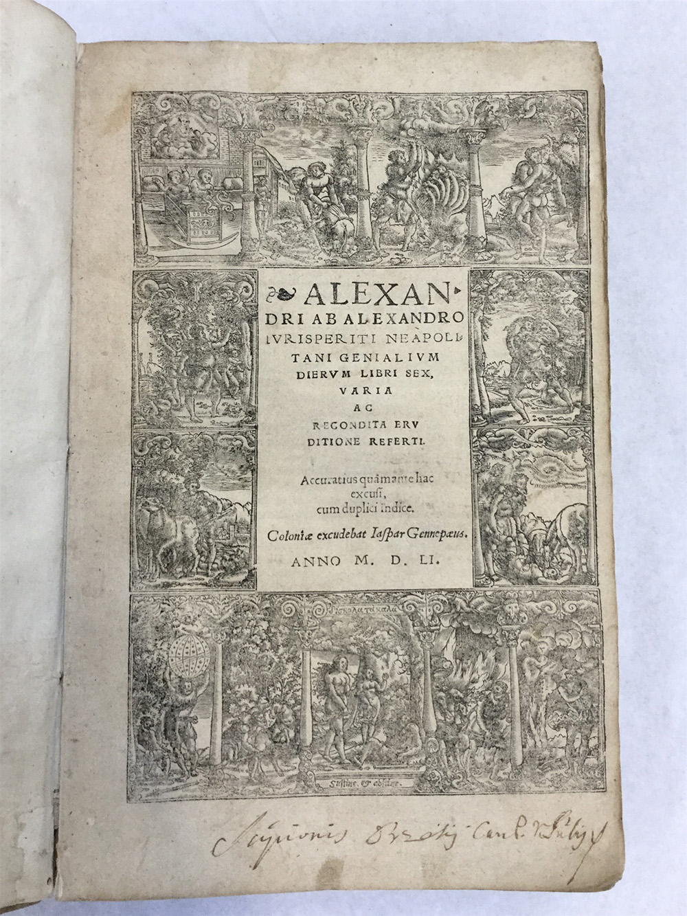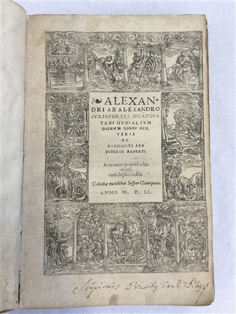 ALESSANDRI, Alessandro. Genialium dierum libri sex. Colonia: Gaspare Gennepaeus, 1551. Vol. in 4to, con frontepizio entro elaborata cornice xilografica. Legatura coeva in pergamena (lievi aloni di umidità).