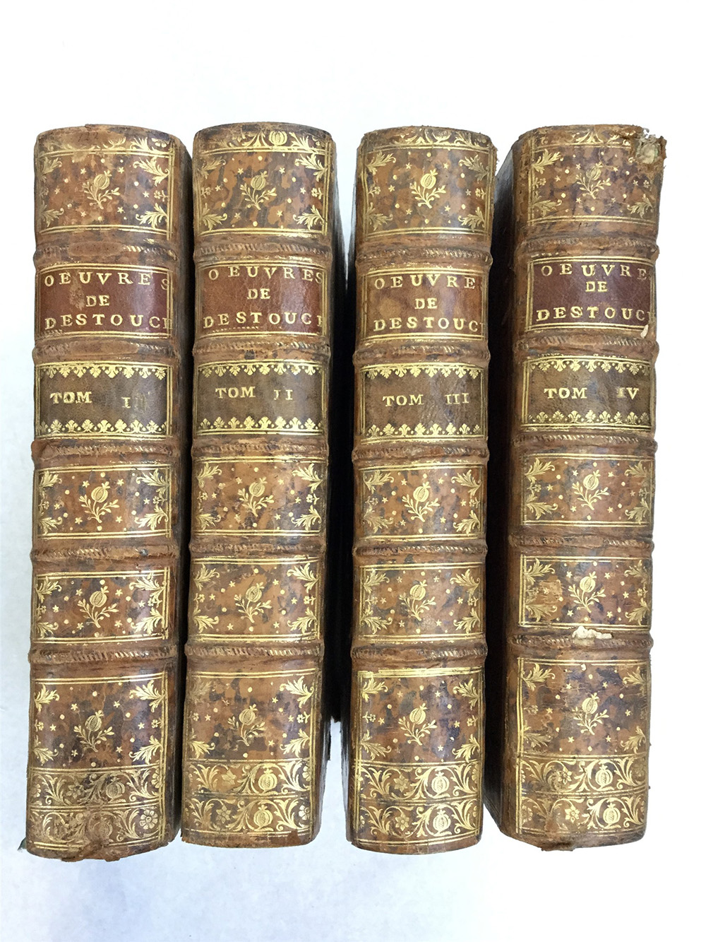 NERICAULT DESTOUCHES. Oeuvres dramatiques. Parigi: Impremerie Royale, 1757. 4 voll. in 4to. Legatura in pelle coeva, dorsi in oro, tagli rossi.