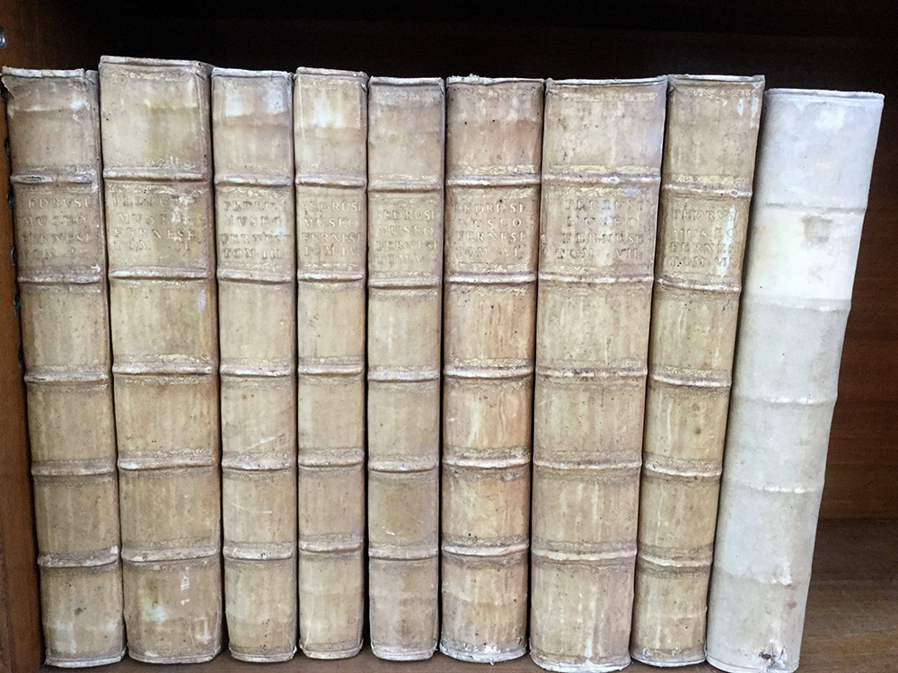 PEDRUSI, Paolo. I Cesari. Parma: Stamperia di Sua altezza Serenissima, 1694-1724. 9/10 voll. in folio, con numerose incisioni in rame. I primi 8 in legatura in modo uniforme in piena pergamena coeva con titoli in oro al dorso e tagli marmorizzati; il nono volume è in pergamena, ma non uniforme. Prima edizione di questa monumentale opera di numismatica.