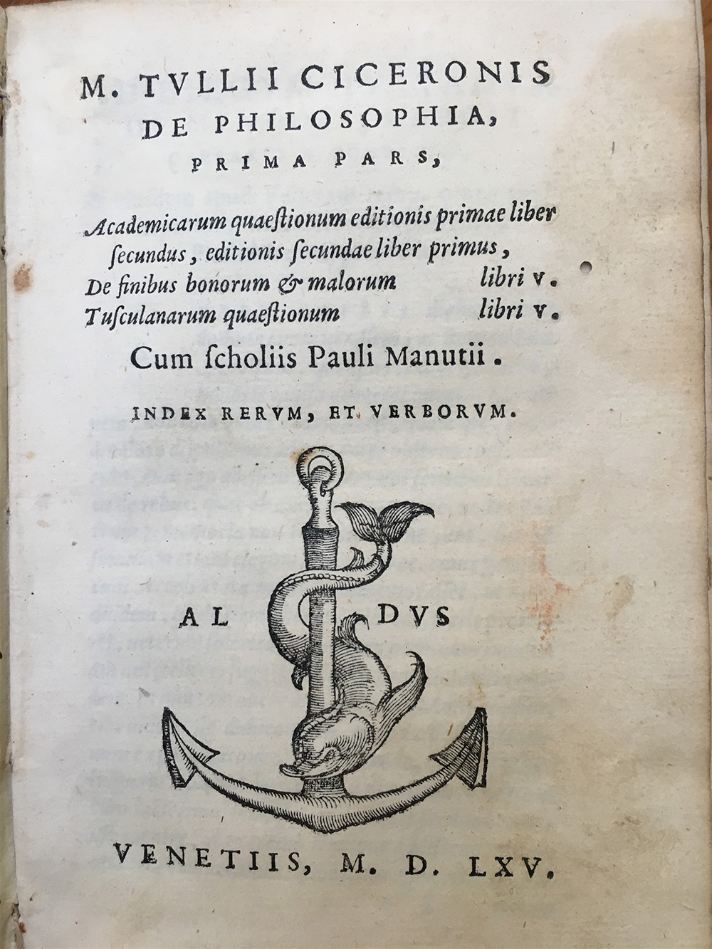 CICERONE, Marco Tullio. De Philosophia. Venezia: Aldo Manuzio, 1565. Vol. in...