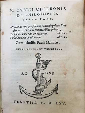 CICERONE, Marco Tullio. De Philosophia. Venezia: Aldo Manuzio, 1565. Vol. in 8vo, con marca tipografica al frontespizio (lievi macchie di umidità ai margini). Legatura in piena pergamena (lievi difetti).
